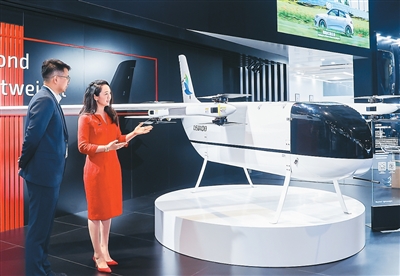 图为在第八届进博会上,亨睿碳纤维市场总监陈文瑾(右)向观众介绍中型电动垂直起降物流无人机 LEU100真机。受访者供图