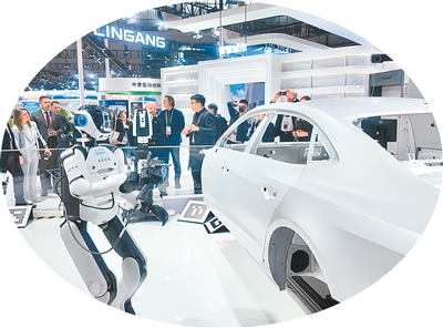 第八届进博会技术装备展区,海克斯康集团展位上,AEON工业人形机器人手持海克斯康Leica扫描头对白车身进行扫描。本报记者 林子涵摄