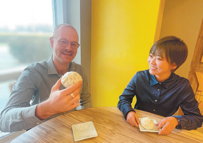 在上海迪士尼度假区,卡林(左)和同事一起品尝包子。