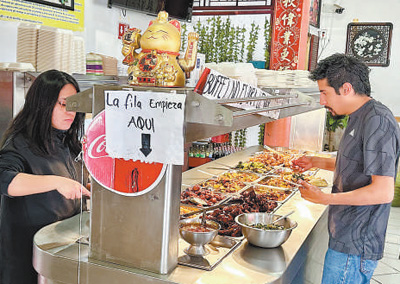 在墨西哥城一家中餐自助餐厅内,当地食客挑选菜品。